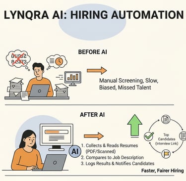 Lynqra’s hiring automation screens applicants in seconds. It collects applications, reads resumes (even scanned PDFs), compares them to the job description, and logs results. Top candidates get interview links, others receive quick updates, and borderline cases are flagged—saving time and making hiring faster and fairer.